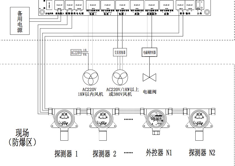 8、本系統由1個氣體報警控制器、1-150個氣體探測器組成。需要的時候,可加外控器控制風機、閥門等設備。